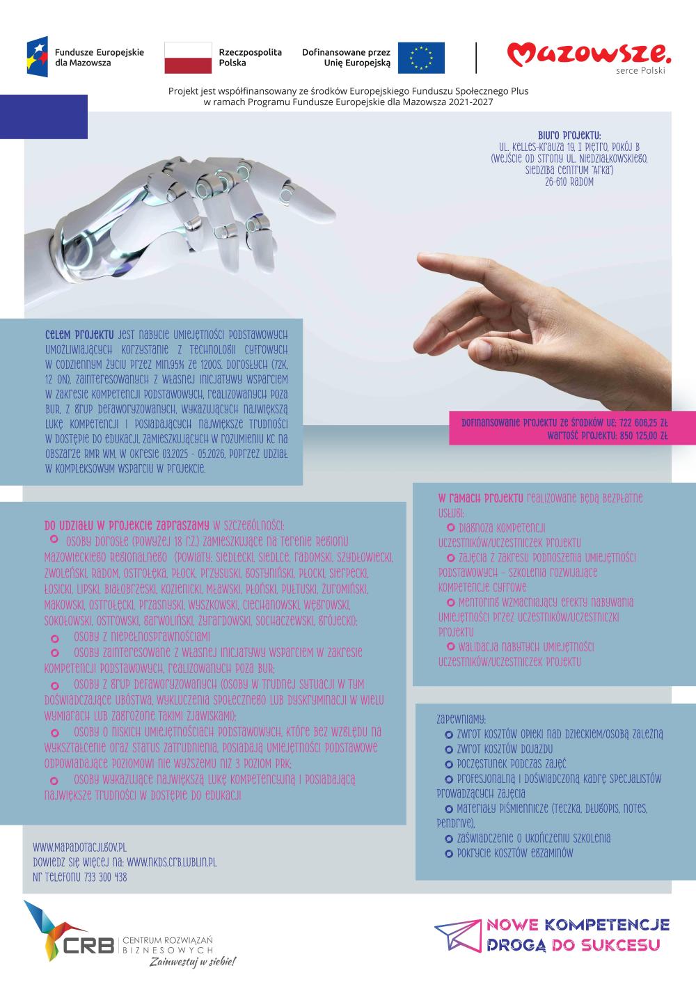 Fundacja Centrum Rozwiązań Biznesowych realizuje projekt: „Nowe kompetencje drogą do sukcesu”, który jest wspófinansowany ze środków Europejskiego Funduszu Społecznego Plus w ramach Programu Fundusze Europejskie dla Mazowsza 2021-2027