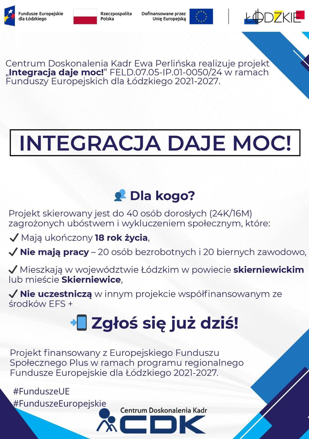 Powiatowy Urząd Pracy w Skierniewicach informuje, iż w dniu 5 czerwca 2025 r. o godzinie 10:00 w siedzibie Urzędu odbędzie spotkanie rekrutacyjne w ramach projektu "Integracja Daje Moc!" realizowanego przez Centrum Doskonalenia Kadr Ewa Perlińska w ramach Funduszy Europejskich dla Łódzkiego 2021-2027.